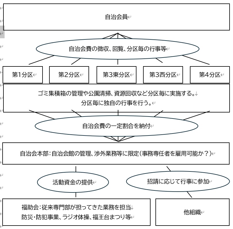 - 自治会本部や専門部が担ってきた業務や事業を各分区、および福助会が企画運営する