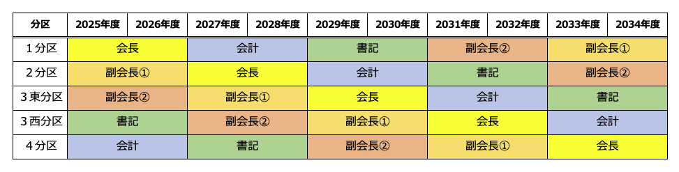 2025年度と2026年度は、1分区から会長、2分区から副会長①、3東分区から副会長②、3西分区から書記、および4分区から会計をそれぞれ選出して本部役員を担ってもらい、2027年度から分区を変えて本部役員を交代し、以降同様に2年ごとに分区を変えて交代していく流れとなる。