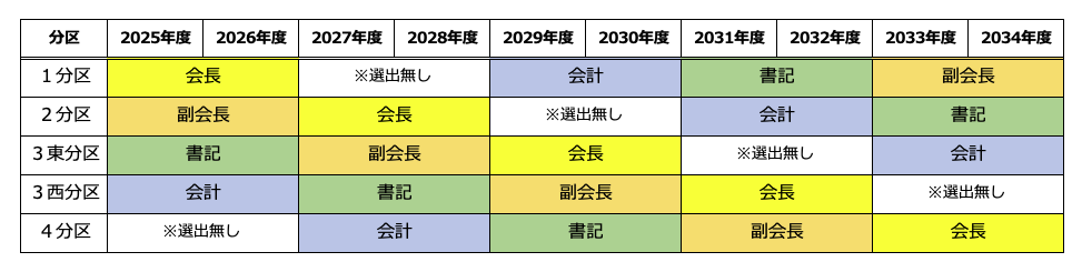2025年度と2026年度は、1分区から会長、2分区から副会長①、3東分区から副会長②、3西分区から書記、および4分区から会計をそれぞれ選出して本部役員を担ってもらい、2027年度から分区を変えて本部役員を交代し、以降同様に2年ごとに分区を変えて交代していく流れとなる。
